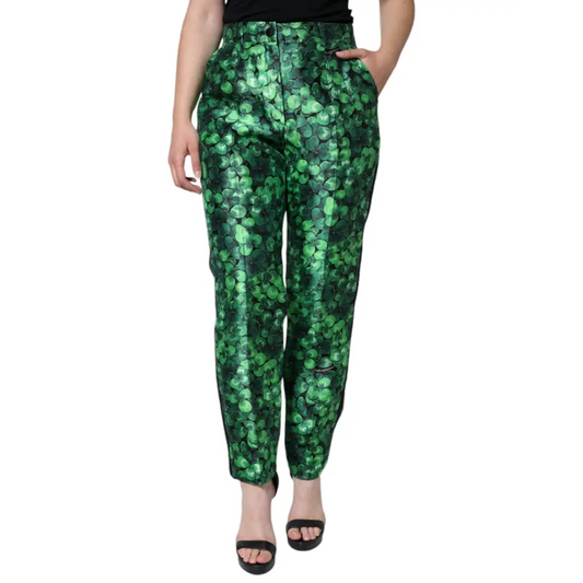 Dolce & Gabbana Green Clover Silk Satin High Waist Tapered Pants