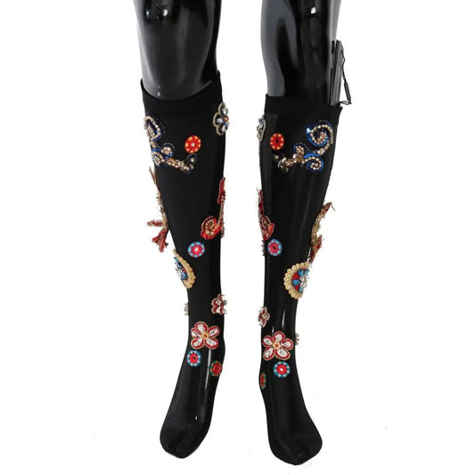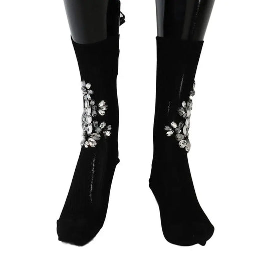 Dolce & Gabbana Black Knitted Floral Clear Crystal Socks