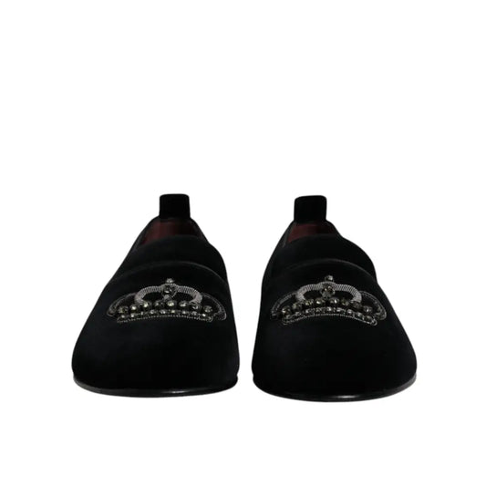 Dolce & Gabbana Black Velvet Crystal Crown Loafers Formal Dress Shoes
