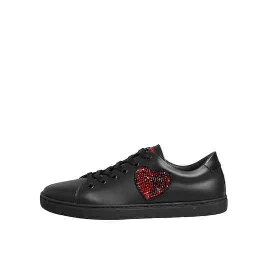 Dolce & Gabbana Black Leather Crystal Heart Low Top Sneakers Shoes